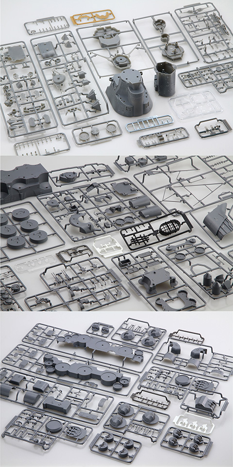 □主なパーツは組立に際して塗装・接着が必要となります。艦橋部のみ着色済みパーツなので塗装をしなくても雰囲気ある状態にできます。