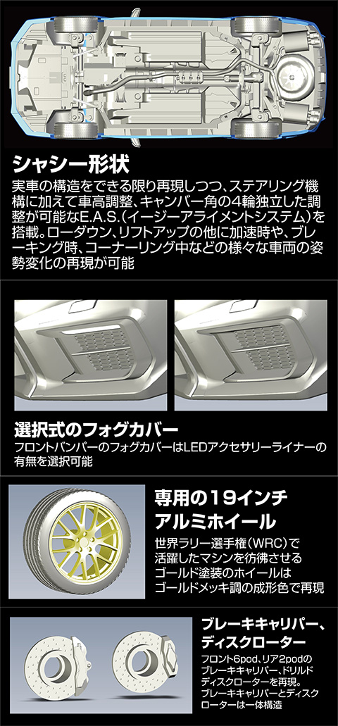 実車の構造をできる限り再現しつつ、ステアリング機構に加えて車高調整、キャンバー角の4輪独立した調整が可能なE.A.S.(イージーアライメントシステム)を搭載。