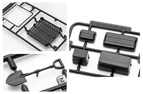 車両へのアクセサリーおよび積載物パーツ(いずれも成形色はブラック)が付属。