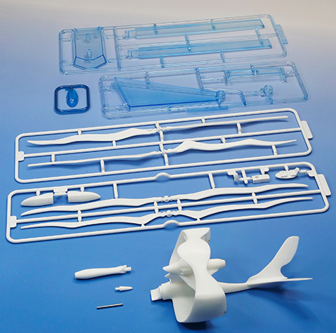 □透明度や組み立て精度が必要なコクピット周辺は、一般的なプラキットと同じ金型を用いたプラ成形(PS 樹脂/ABS 樹脂)。