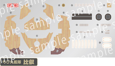 □シールには複雑な木目模様を再現した木甲板、軍艦旗、艦橋窓、探照灯レンズ面、防水覆などを収録。
