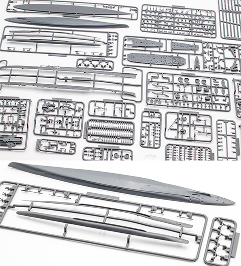 ・左右で分割式のパーツ構成、水線で乾舷・艦底を分割した構造