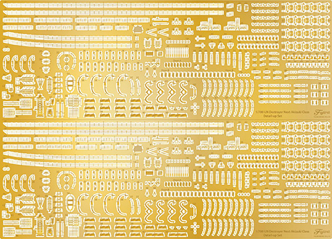 エッチングパーツには手摺、13号電探、21号電探、スキッドビーム、爆雷装填、舷梯、ダビット各種、ラッタル、旗竿、単装機銃、魚雷スクリュー、防盾、対空照準器、煙突周囲ディテールなどを収録。