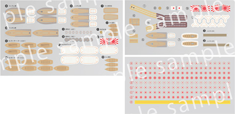 □エッチングパーツには艦体、艦橋、砲塔部などの各種手摺(脚無しタイプ、一部弛み表現付き)、 梯子、 ラッタル、水密扉、21号電探、探照灯台座トラス、 クレーン、 艦橋窓枠、 ボートダビッド、 射出機、機銃シールド、機銃照準器、 単装機銃、水上機プロペラ、ループアンテナなどを収録。